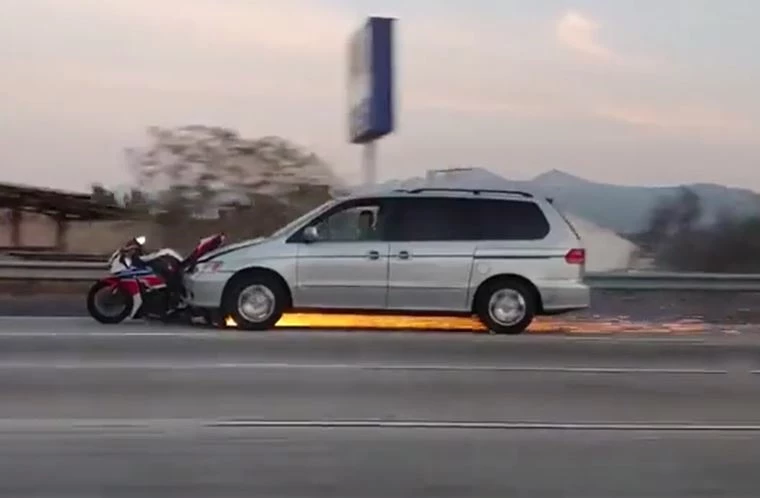Sau đó, tài xế minivan đã rời khỏi cao tốc, bỏ lại chiếc ô tô và nhanh chóng chạy trốn. Người điều khiển xe phân khối lớn bị đau ở tay và chân nhưng may mắn không gặp chấn thương nghiêm trọng.