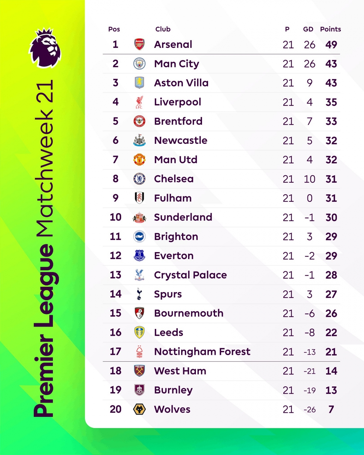 Như vậy, việc cả bốn đội bóng dẫn đầu bảng xếp hạng đều không thắng ở vòng 21 khiến cuộc đua vô địch Ngoại hạng Anh 2025/2026 vẫn xoay quanh ba cái tên: Arsenal (49 điểm), Man City (43 điểm) và Aston Villa (43 điểm).