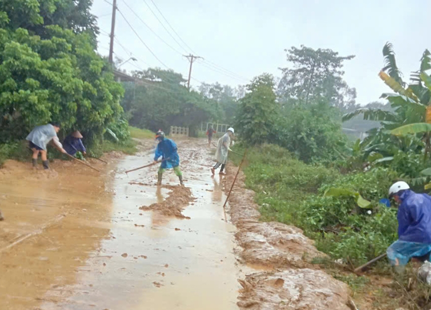 Các lực lượng tại xã Hưng Lộc cùng người dân dọn bùn sau lũ. Ảnh: Hữu Phúc