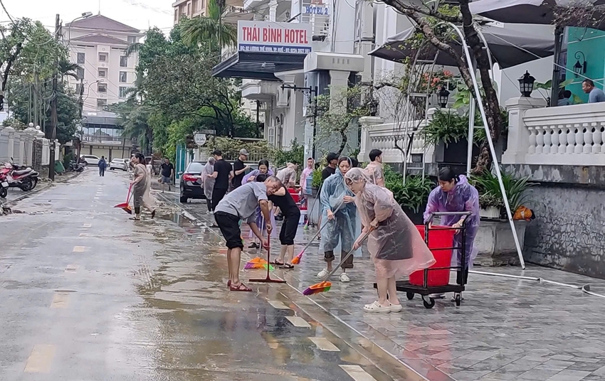 Các tổ dân phố, đoàn viên thanh niên, lực lượng dân quân tự vệ cùng công nhân môi trường đô thị tích cực thu gom rác thải, bùn đất, khơi thông cống rãnh, xịt rửa đường sá và khu dân cư, trong đó có nhiều tuyến đường ngập sâu, như Phan Đình Phùng, Phan Châu Trinh, Bùi Thị Xuân, Nguyễn Huệ... Với phương châm “nước rút đến đâu, làm sạch đến đó”, hoạt động vệ sinh được triển khai đồng bộ.