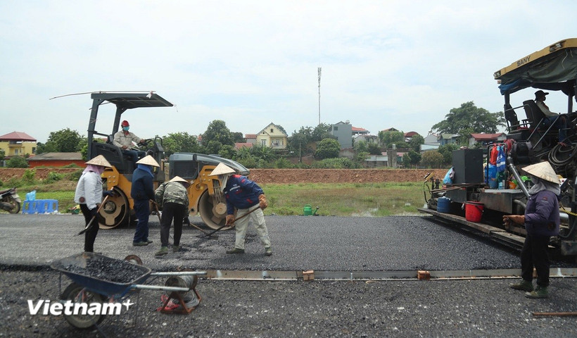 Nhà thầu thi công thảm nhựa nền đường một dự án đường bộ cao tốc. (Ảnh: Việt Hùng/Vietnam+)