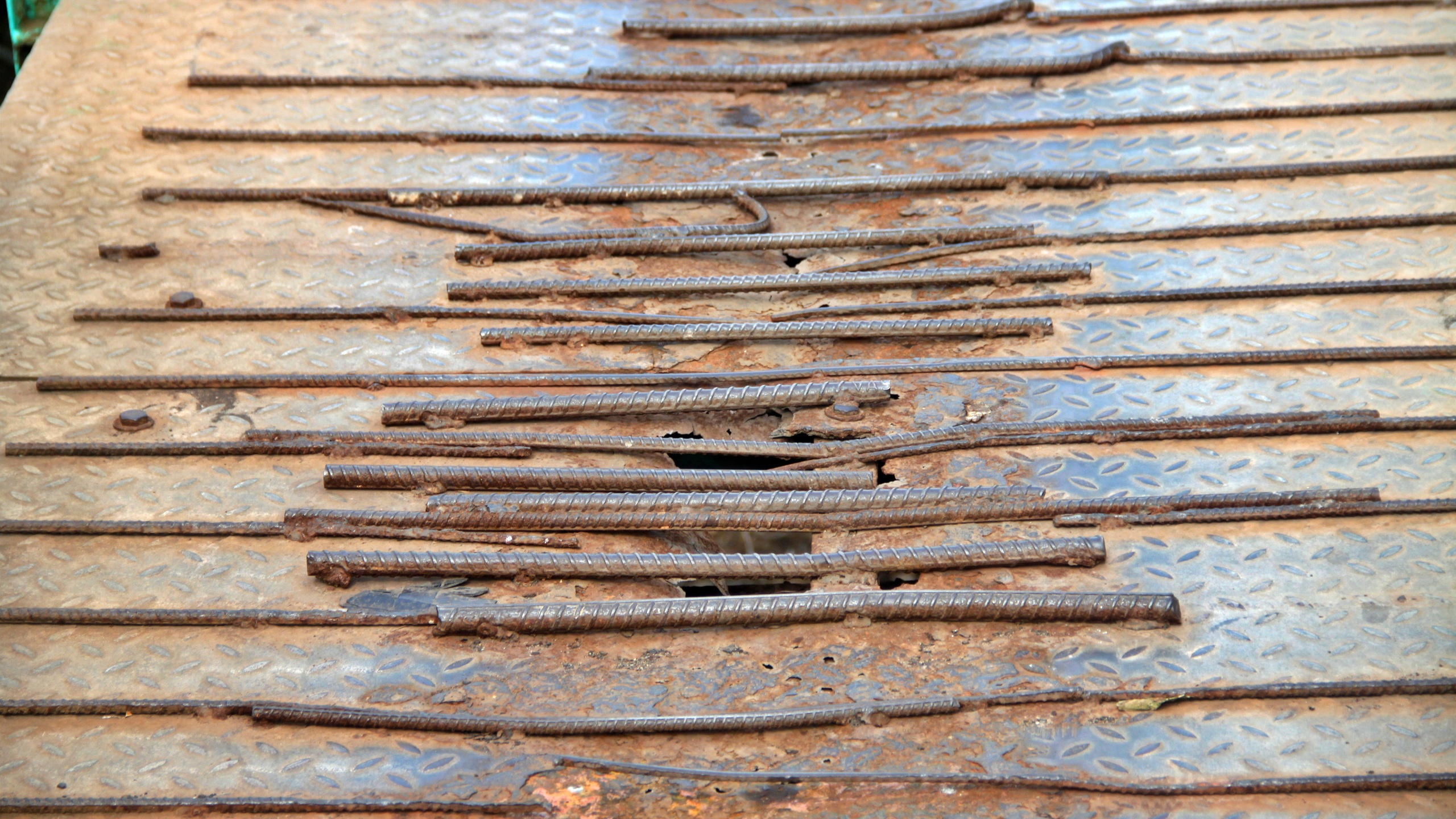 Những tấm thép trên bản mặt cầu treo Vĩnh Mỹ qua thời gian dài đưa vào sử dụng đã bị rỉ sét và thủng lổ, không đảm bảo an toàn cho người và phương tiện qua lại.