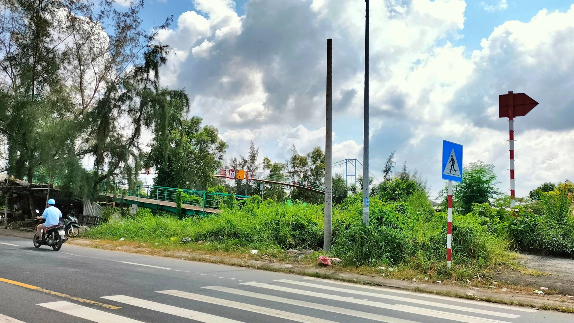 Đường dẫn lên cầu treo Vĩnh Mỹ (phía giáp với tuyến đường quốc lộ 1) đã được rào chắn lại, lâu ngày cỏ mọc um tùm.