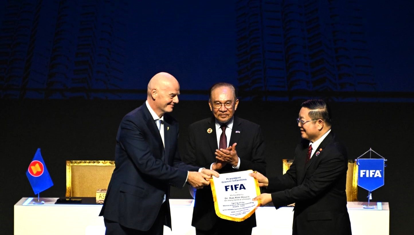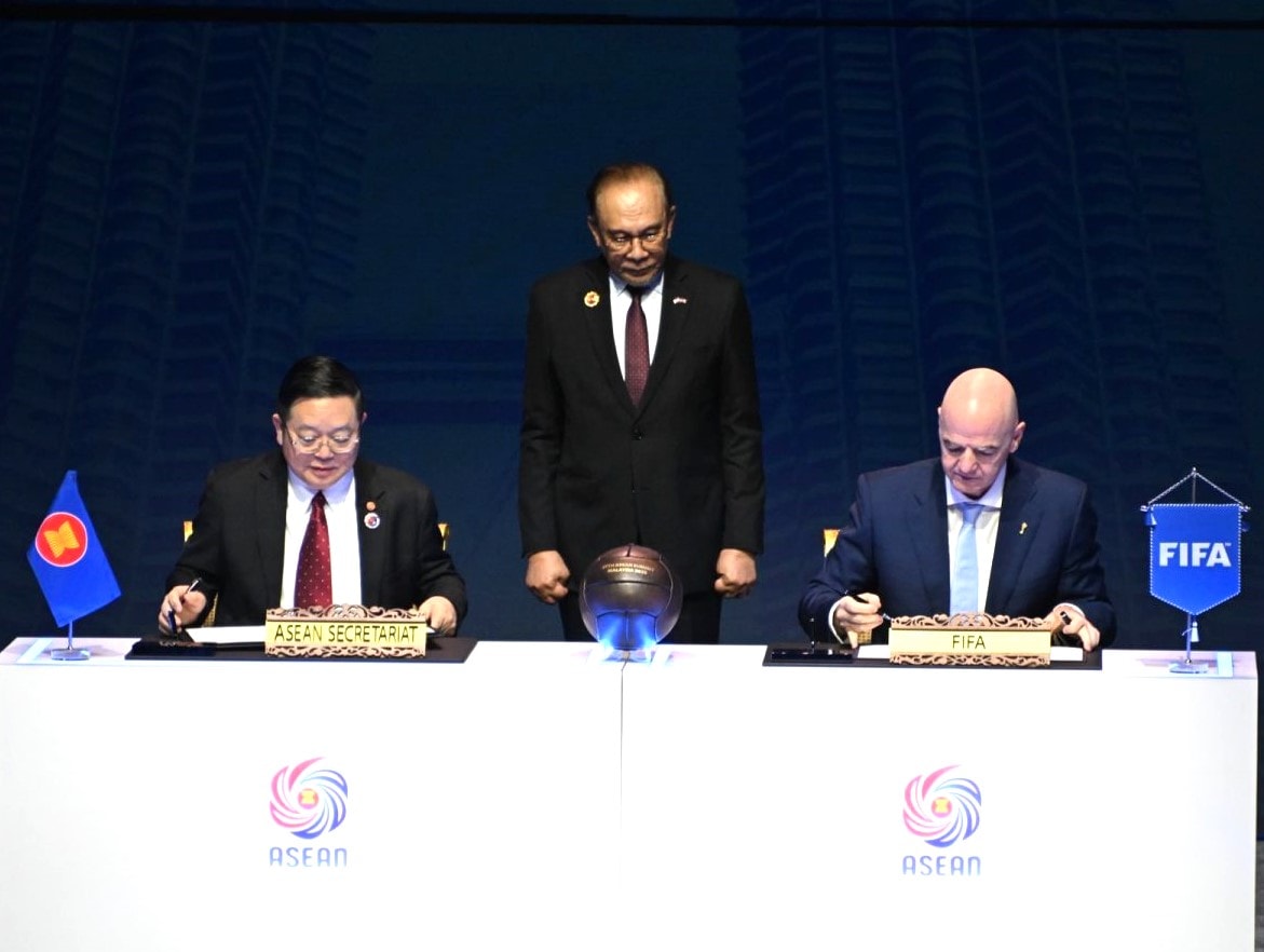 Biên bản ghi nhớ được ký giữa Chủ tịch FIFA Gianni Infantino và Tổng Thư ký ASEAN Kao Kim Hourn, dưới sự chứng kiến của Chủ tịch ASEAN kiêm Thủ tướng Malaysia Dato’ Seri Anwar Bin Ibrahim. Ảnh: FIFA