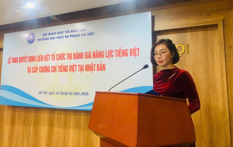 Phát biểu tại Lễ trao Quyết định, Phó Giáo sư, Tiến sĩ Nguyễn Đức Sơn - Hiệu trưởng Trường đại học Sư phạm Hà Nội cho biết, kỳ thi đánh giá năng lực tiếng Việt đầu tiên tại Nhật Bản dự kiến được tổ chức vào tháng 4/2026, sử dụng bài trắc nghiệm chuẩn hóa và được Bộ Giáo dục và Đào tạo cấp phép.