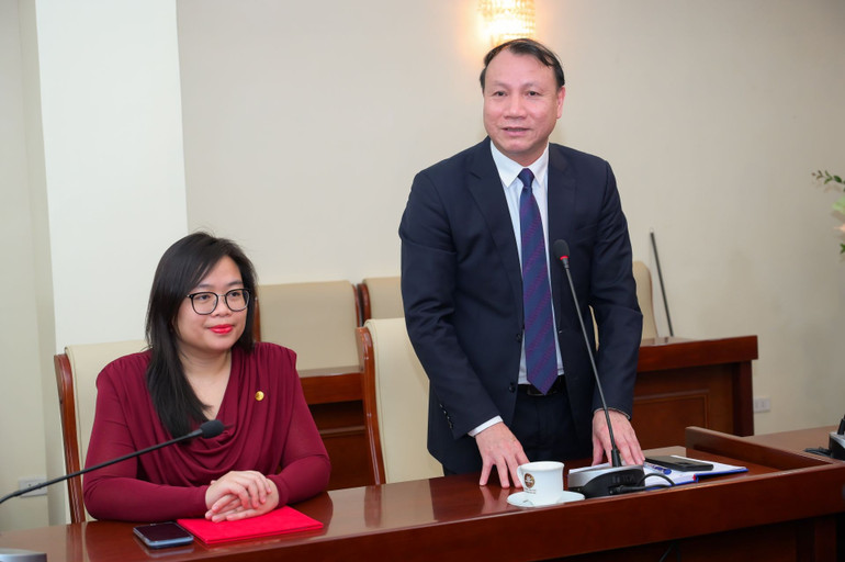 Phó Giáo sư, Tiến sĩ Nguyễn Đức Sơn - Hiệu trưởng Trường đại học Sư phạm Hà Nội và bà Lê Thương - Phó Chủ tịch thường trực Hiệp hội Xúc tiến hợp tác kinh tế Việt Nam-Nhật Bản tại Lễ trao Quyết định liên kết tổ chức thi đánh giá năng lực tiếng Việt và cấp chứng chỉ tiếng Việt tại Nhật Bản.