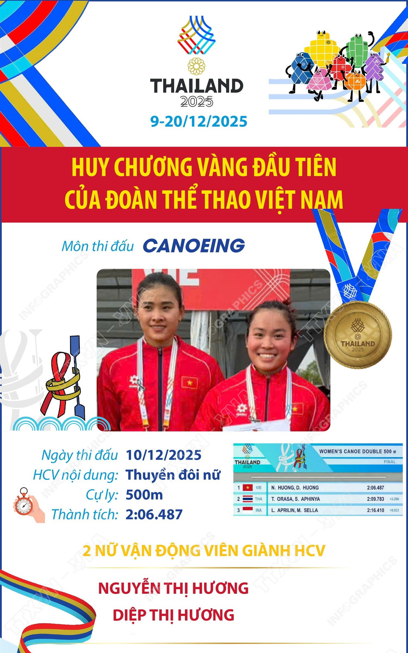 Ngày 10/12/2025, vận động viên Nguyễn Thị Hương và vận động viên Diệp Thị Hương đã xuất sắc mang về tấm Huy chương Vàng đầu tiên cho Đoàn Thể thao Việt Nam, ở nội dung Canoeing đôi nữ 500m với thành tích 2 phút 06 giây 487 tại SEA Games 33 diễn ra tại Thái Lan.