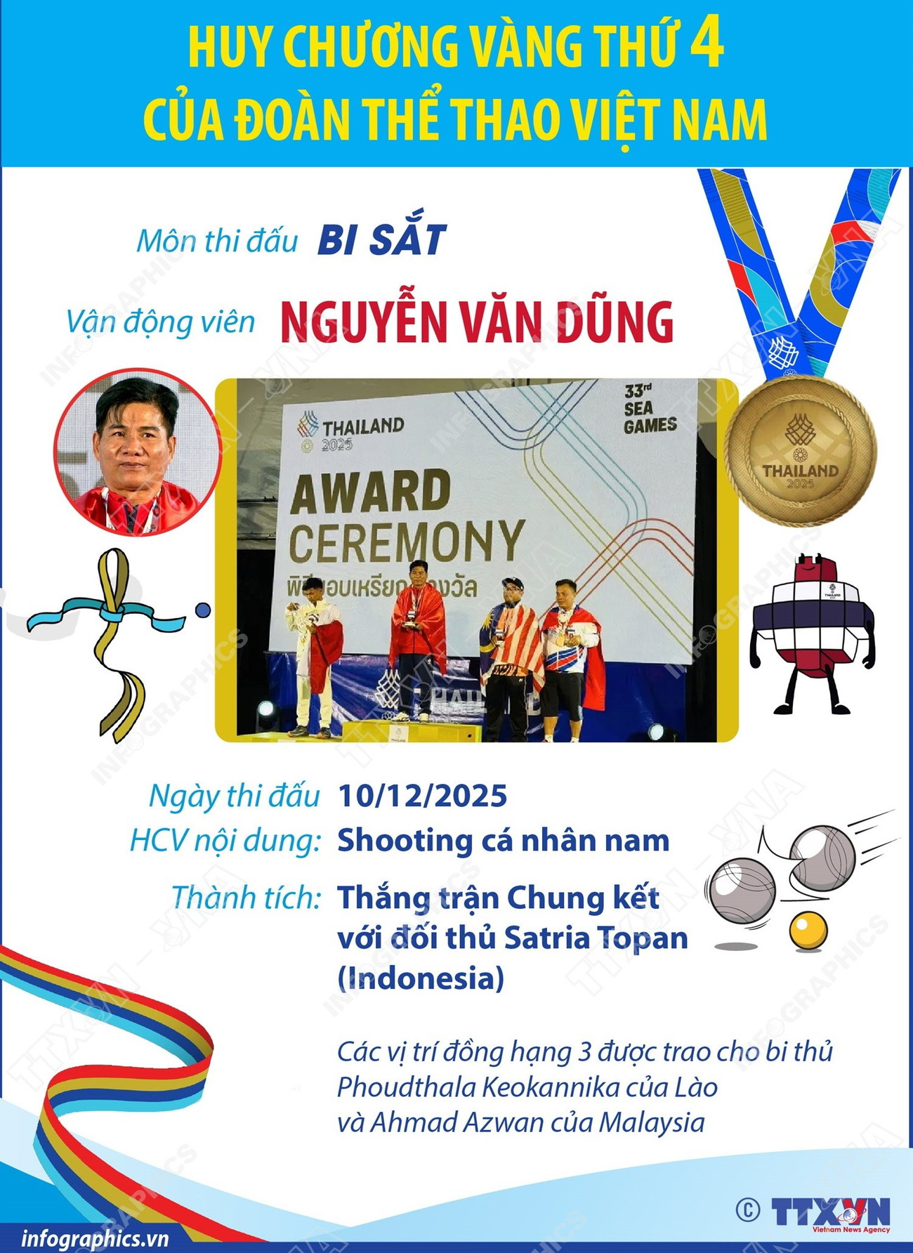 Vận động Nguyễn Văn Dũng đã xuất sắc mang về tấm Huy chương Vàng thứ 4 cho Đoàn Thể thao Việt Nam, ở nội dung shooting môn bi sắt tại SEA Games 33 diễn ra tại Thái Lan./.