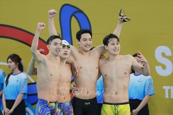 4 VĐV Nguyễn Viết Tường, Nguyễn Huy Hoàng, Trần Văn Nguyễn Quốc, Trần Hưng Nguyên giành HCV nội dung bơi 4x200 m tự do nam. Ảnh: Minh Quyết/PV TTXVN tại Thái Lan
