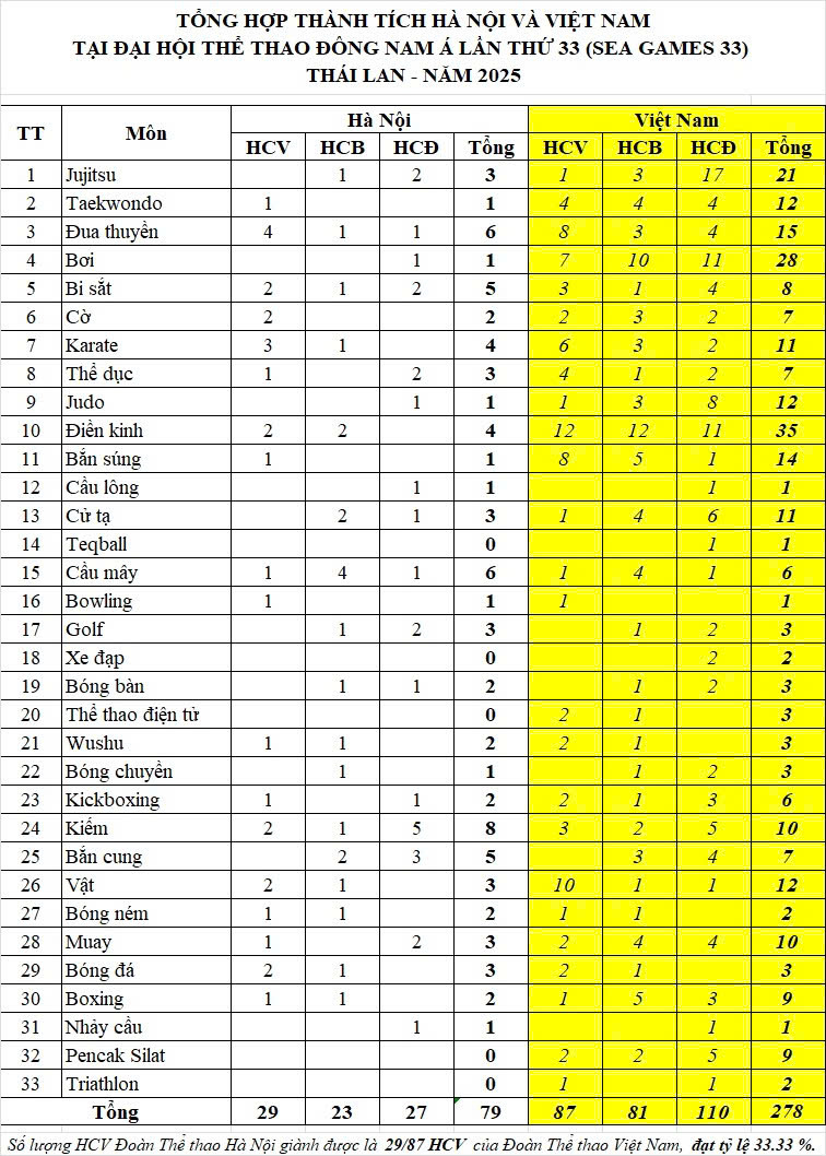 Bảng thành tích của Đoàn thể thao Việt Nam tại SEA Games 33 và những đóng góp của thể thao Hà Nội.