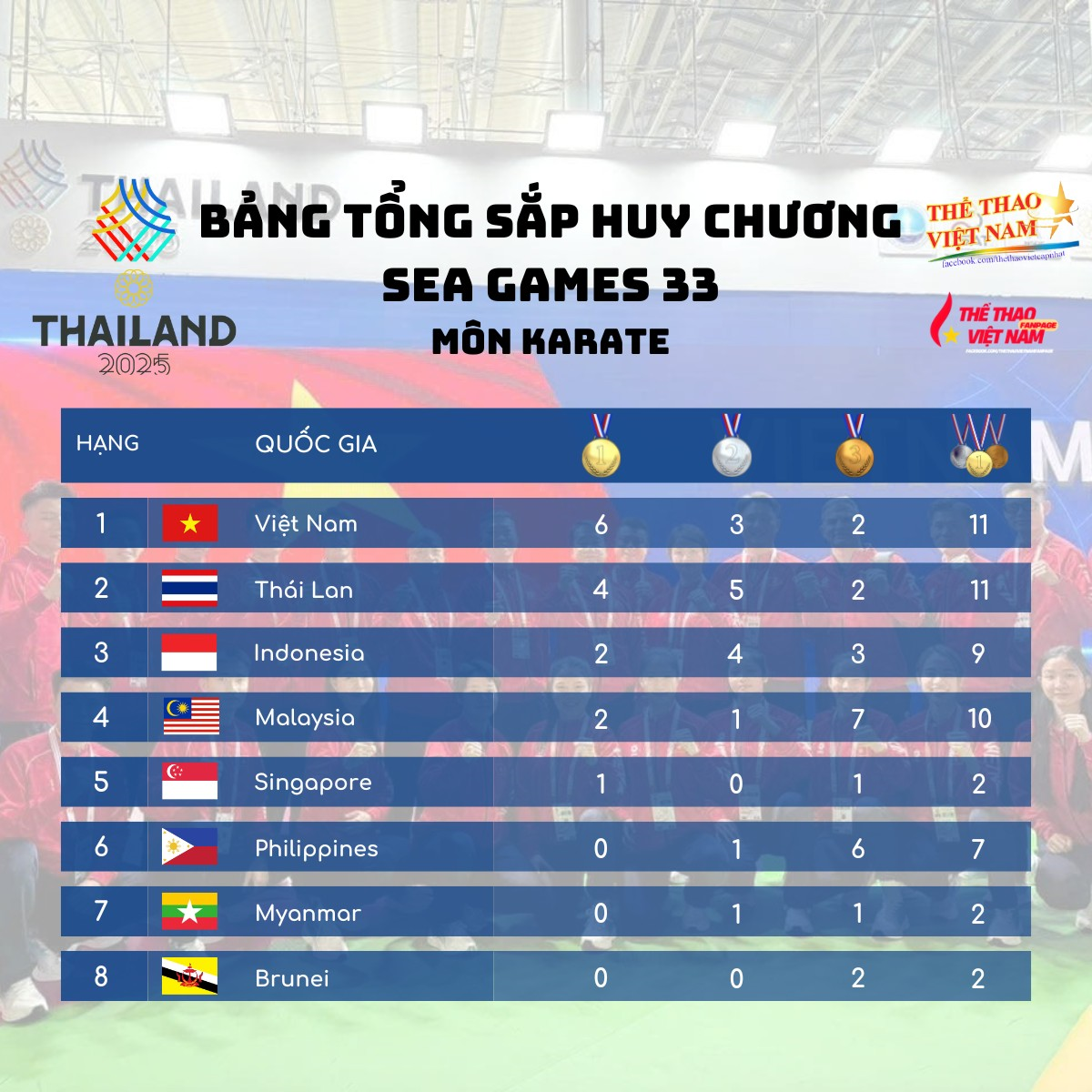 Xếp thứ 2 trên bảng tổng sắp huy chương môn karate ở SEA Games 33 là Thái Lan với 4 huy chương vàng, 5 huy chương bạc và 2 huy chương đồng.