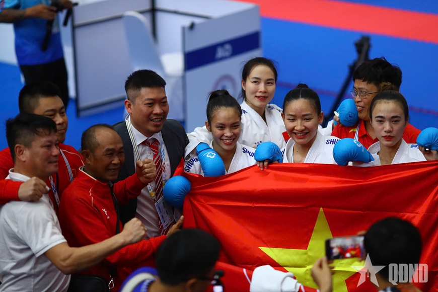 Các nữ võ sĩ karate Việt Nam rạng rỡ khi giành huy chương Vàng đối kháng đồng đội.