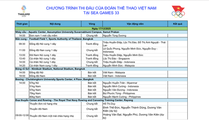 Lịch thi đấu ngày 17-12 của Đoàn Thể thao Việt Nam: