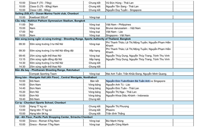 Bóng bàn sau cú sốc ở chung kết đồng đội nam sẽ tìm cách "rửa hận" người Singapore với Nguyễn Đức Tuân/Đoàn Bá Tuấn Anh ra sân ở bán kết đôi nam. Nguyễn Anh Tú, Nguyễn Đức Tuân, Nguyễn Thị Nga và Nguyễn Khoa Diệu Khánh sẽ tranh tài nội dung đơn với quyết tâm tìm kiếm tấm HCV đầu tiên cho bóng bàn Việt Nam tại đại hội lần này.