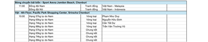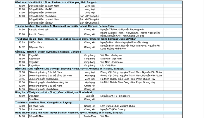 Lịch thi đấu ngày 19-12 của Đoàn Thể thao Việt Nam: