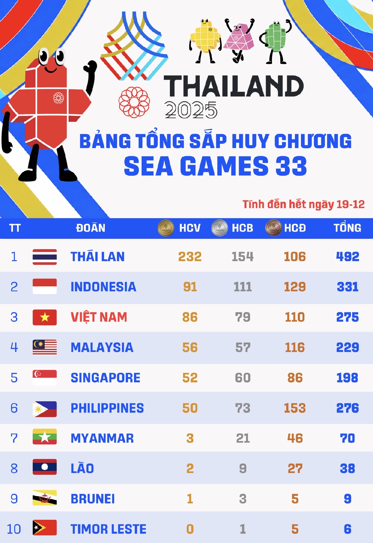 Bảng tổng sắp huy chương SEA Games 33 tính đến hết ngày 19/12.
