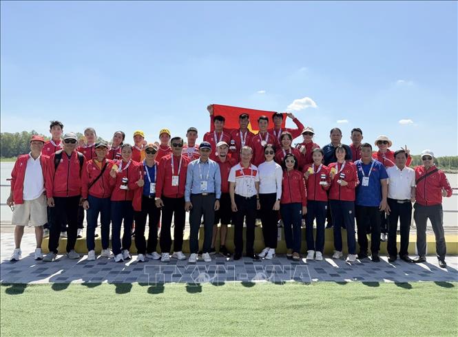 VĐV Hồ Thị Duy đã về nhất chung kết thuyền đơn nữ hạng nhẹ để mang về cho Việt Nam tấm HCV đầu tiên trong ngày. Ảnh: TTXVN phát