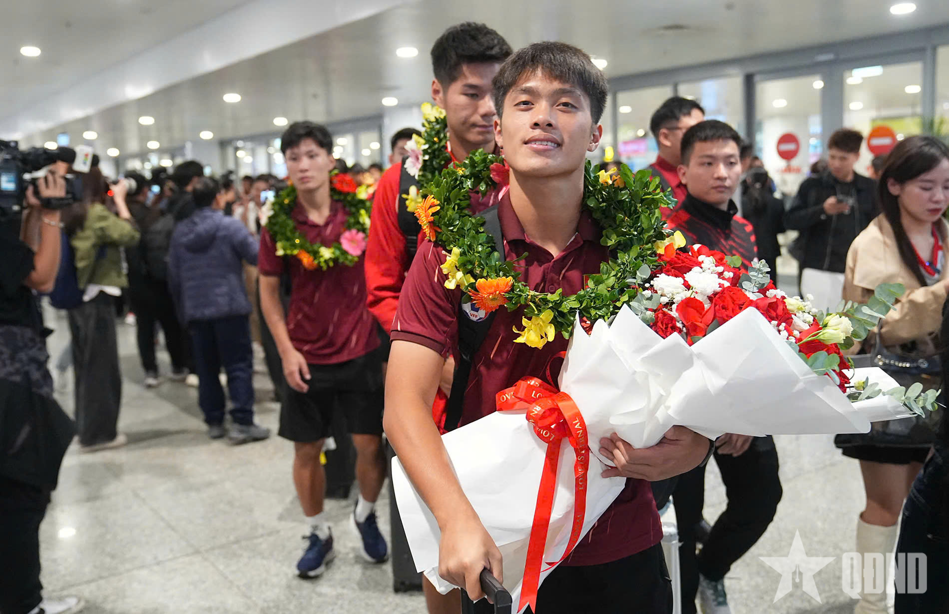 Đi ngay sau huấn luyện viên Kim Sang-sik là tiền đạo Đình Bắc, Thanh Nhàn, Khuất Văn Khang... tất cả được chào đón nồng nhiệt khi vừa giành tấm huy chương vàng SEA Games khiến người hâm mộ cả nước nức lòng.