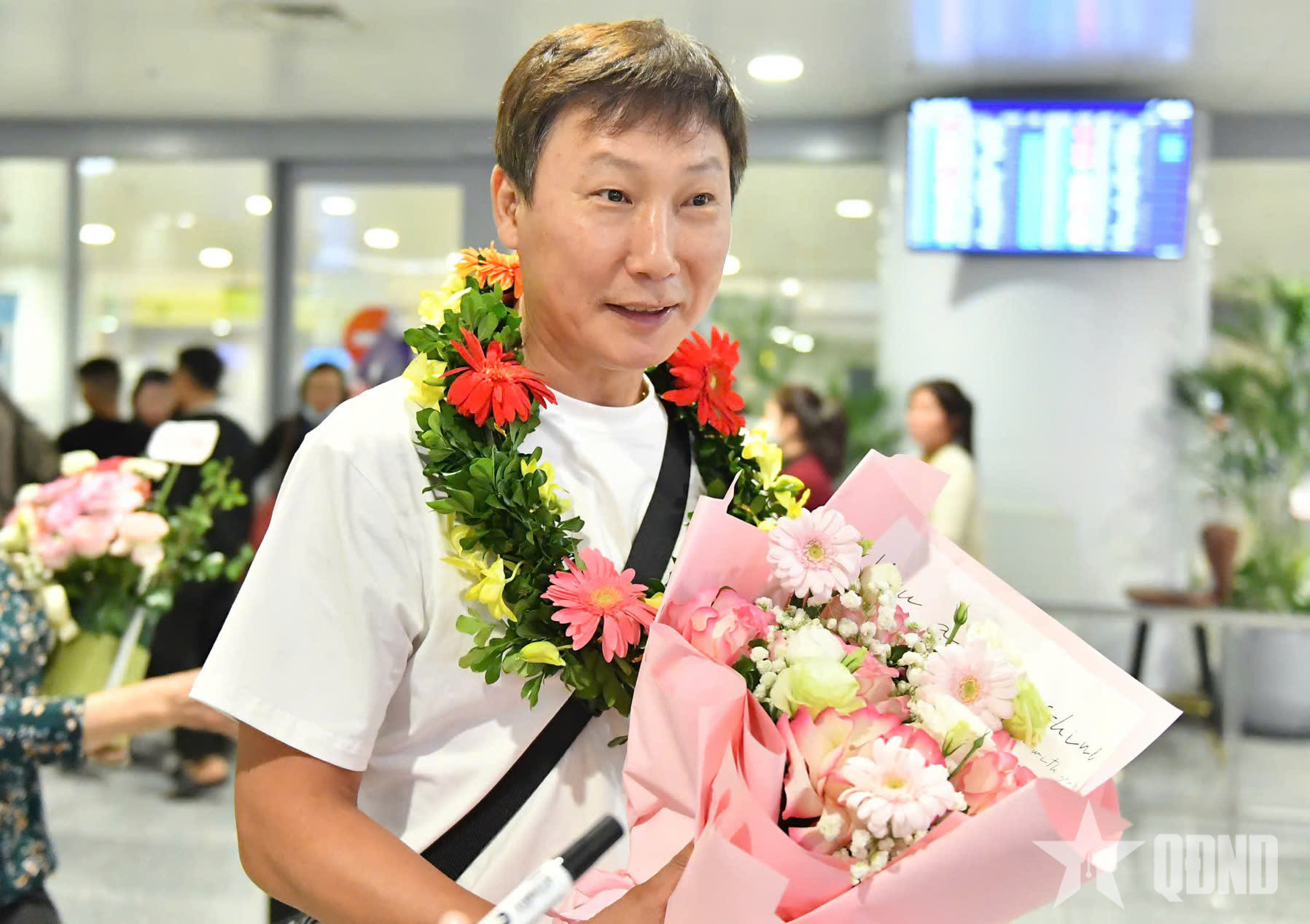 Huấn luyện viên Kim Sang-sik là người đầu tiên xuất hiện tại sảnh sân bay T2 Nội Bài. Chiến lược gia người Hàn Quốc cười rạng rỡ, nhận bó hoa tươi chúc mừng từ lãnh đạo Cục Thể dục Thể thao và VFF. Ông đi vào lịch sử khi dẫn dắt bóng đá Việt Nam vô địch ASEAN Cup, giải U23 Đông Nam Á và SEA Games trong năm nay.