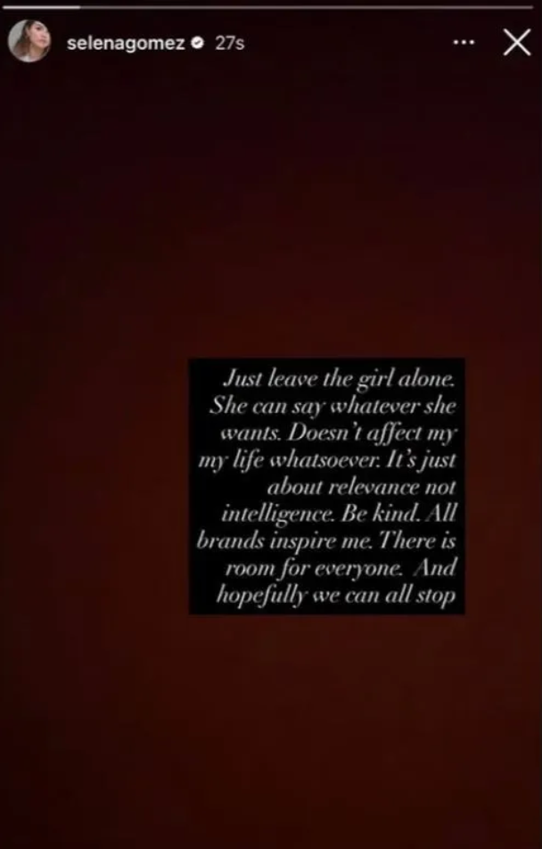Đáp lại, Selena Gomez đăng tải một bài viết ngắn trên Instagram, dường như ám chỉ lại câu nói của Hailey: "Cô ấy có thể nói bất cứ điều gì mình muốn, điều đó chẳng ảnh hưởng gì đến cuộc sống của tôi. Hãy tử tế. Mọi thương hiệu đều có thể truyền cảm hứng. Ai cũng có chỗ đứng riêng". Tuy nhiên, chỉ ít phút sau, nữ ca sĩ đã xóa bài đăng.