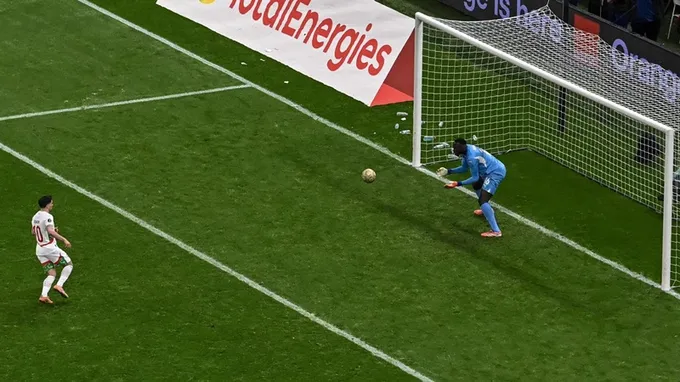Thủ môn Edouard Mendy của Senegal dễ dàng cản phá cú sút phạt đền kiểu Panenka của Brahim Diaz.