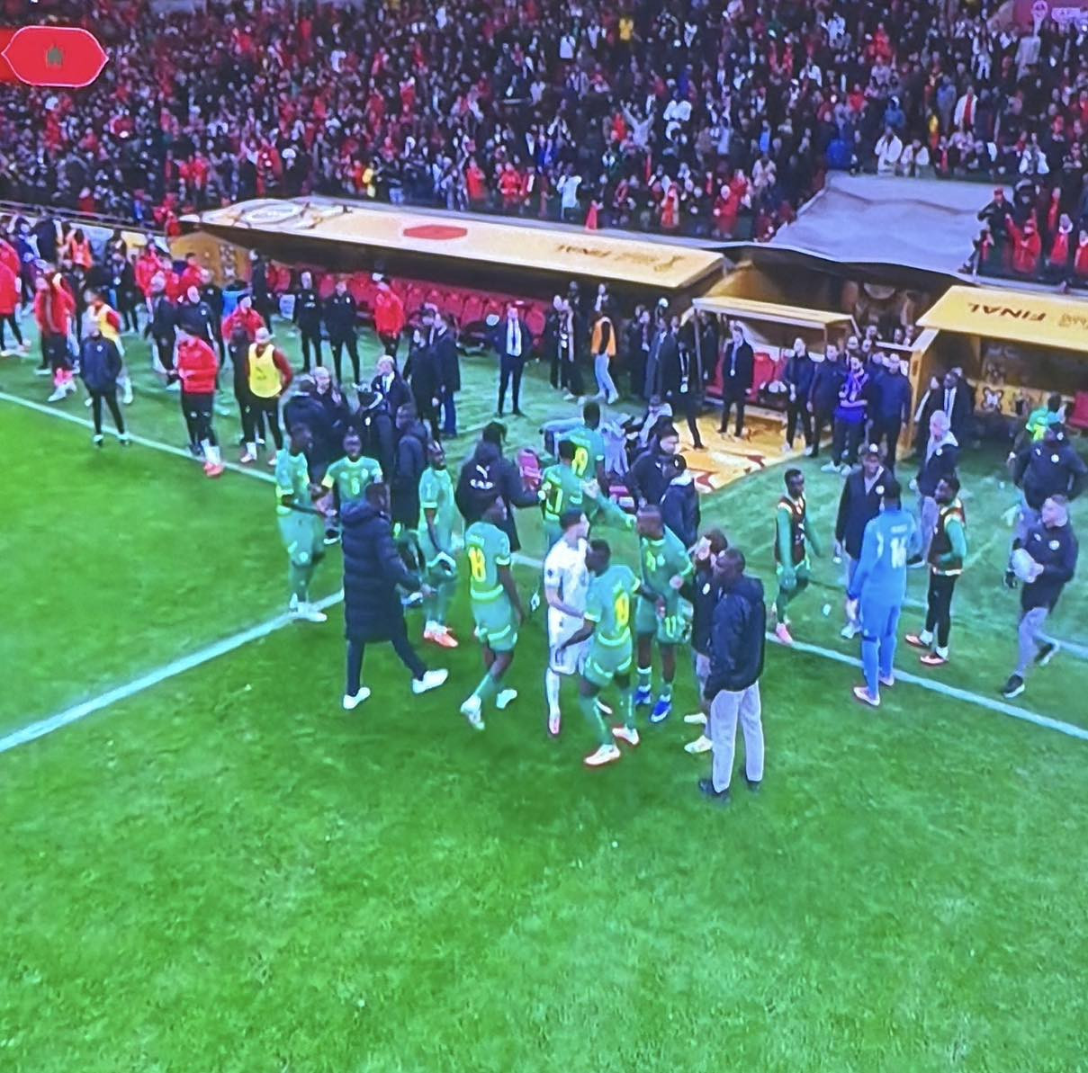 CĐV Senegal tìm cách tràn xuống sân, HLV Pape Thiaw yêu cầu cầu thủ rời vào đường hầm, trong bối cảnh trước đó Senegal cũng bị từ chối bàn thắng của Idrissa Gana Gueye.
