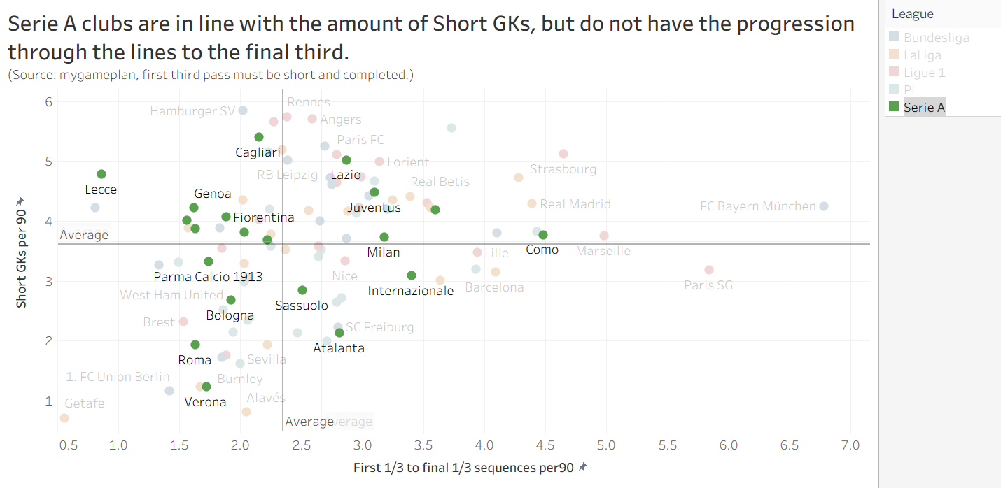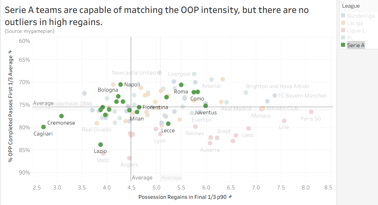 Trung bình một đội bóng châu Âu có 5,08 lần thu hồi bóng ở 1/3 sân đối phương mỗi 90 phút. Serie A chỉ đạt 4,45 lần – con số thấp nhất trong các giải đấu lớn. Chỉ có 6 đội tại Ý vượt qua mức trung bình châu Âu là Genoa, Lecce, Roma, Inter, Como và Juventus. Điều này chứng minh các khối pressing của Ý thiếu đi những "cái bẫy" đủ tinh vi để buộc đối phương mắc sai lầm.