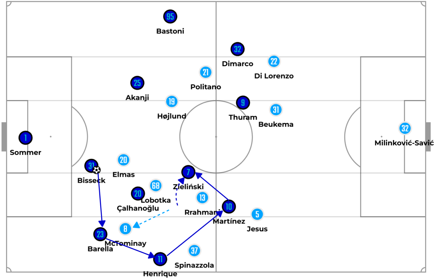 Nghiêm trọng hơn là sự xuất hiện của những đường chuyền ngang tạo thành hình chữ U quanh khối phòng ngự đối thủ mà không có sự đột biến xuyên tuyến. Ngay cả khi sở hữu những chân chuyền đẳng cấp như Manuel Locatelli hay Hakan Calhanoglu, việc có quá nhiều cầu thủ đứng ngoài khối phòng ngự đối phương khiến không gian giữa các tuyến không được khai thác.