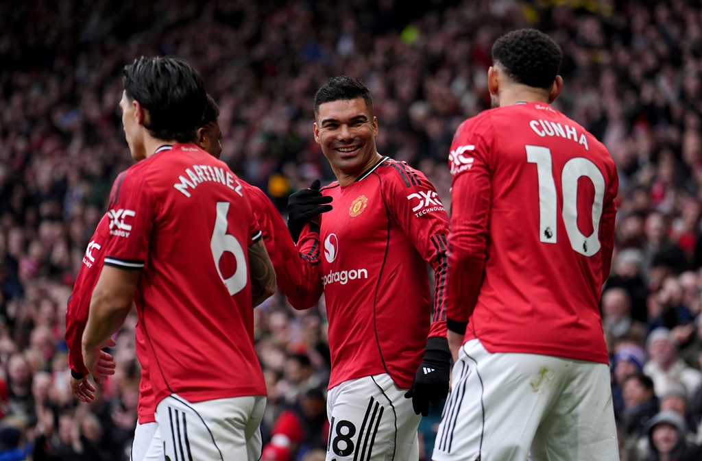 Casemiro (giữa) mừng bàn thắng mở tỷ số cho Man Utd. Ảnh: Sky Sports