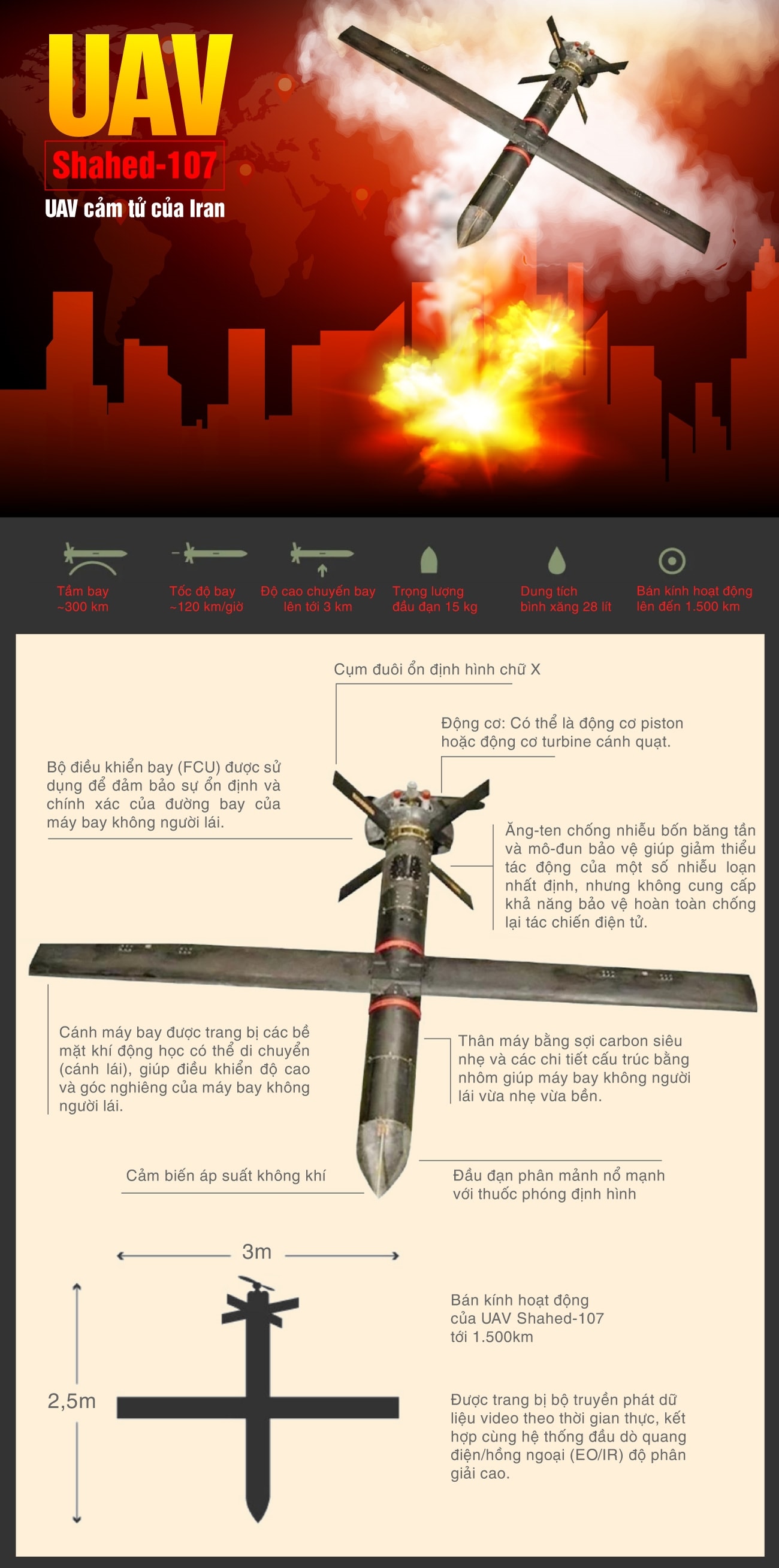 Điểm nhấn đáng chú ý nhất của Shahed-107 chính là bán kính hoạt động lên tới 1.500km. Với tầm bắn này, UAV có khả năng vươn tới các mục tiêu chiến lược nằm sâu trong lãnh thổ đối phương từ các bệ phóng di động. Thiết kế của máy bay ưu tiên tính tối giản nhưng hiệu quả, cho phép mang theo tải trọng chất nổ lớn để tối ưu hóa sức công phá khi tiếp cận mục tiêu.
