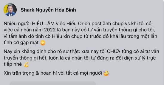 Ngoài ra, nội dung trang nói trên đăng tải cũng gây ảnh hưởng đến người khác. Cụ thể giữa thời điểm nhạy cảm, trang “Shark Nguyễn Hòa Bình” có xác minh của Meta, đăng ảnh chụp kèm với ông Trần Chí Hiếu (tức Hiếu Orion), nhân vật có tiếng trong mảng truyền thông.