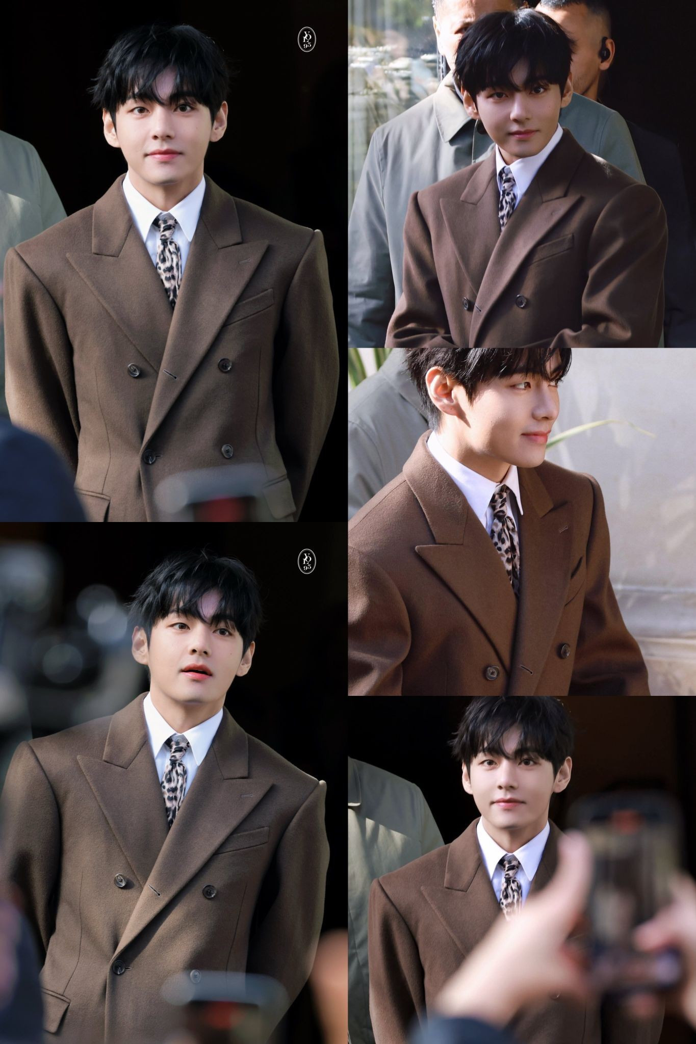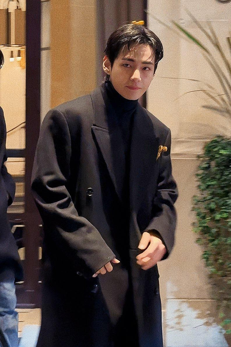 V BTS gây ấn tượng mạnh nhờ vẻ ngoài bảnh bao, phong độ. Mỹ nam diện áo măng-tô có thiết kế độn vai tông màu nâu phối cùng quần ống rộng, tạo điểm nhấn với cà vạt họa tiết da báo thịnh hành.