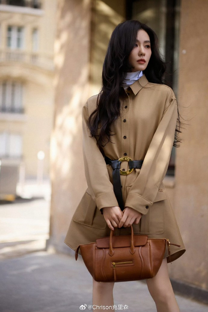 giữ vững phong độ trong ngày tái xuất, cô diện gam nâu sáng phù hợp với tiết trời Thu. Nữ đại sứ toàn cầu lăng xê mẫu đầm sơ mi khaki khoác ngoài áo len cổ lọ trắng, thắt lưng da bản to khóa vàng để tôn vòng eo.