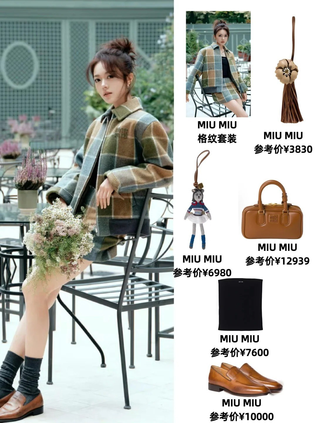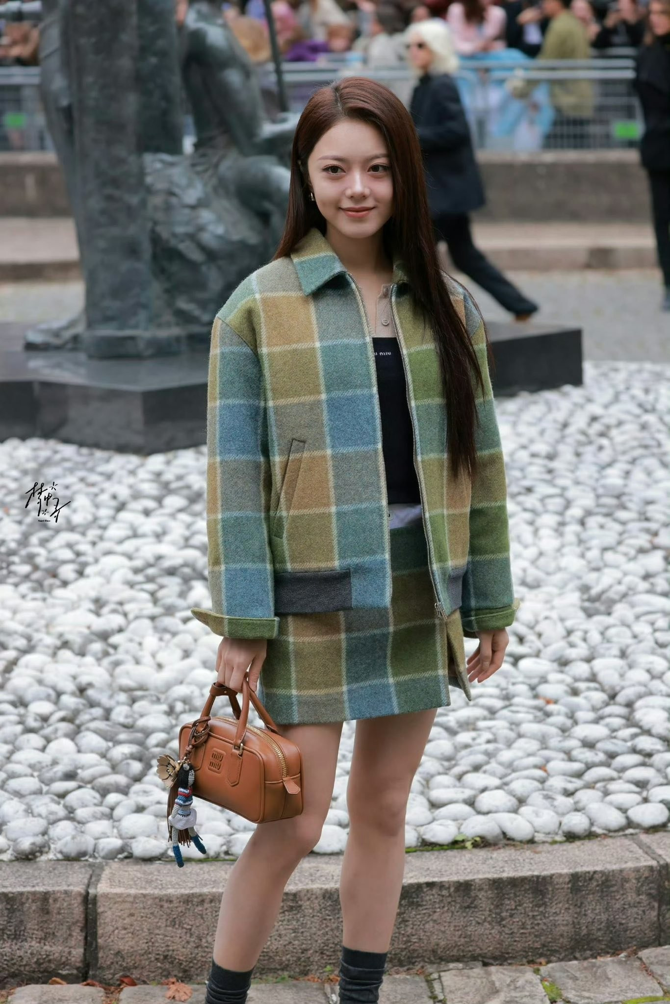 Triệu Kim Mạch có thời gian hơn 2 năm gắn bó với nhà mốt, lần thứ ba ngồi hàng ghế đầu show Miu Miu ở Paris. Nữ đại sứ 23 tuổi diện bộ đồ kẻ caro gam xanh rêu, nâu đất cùng túi xách dáng hộp và giày da màu caramel đồng điệu.