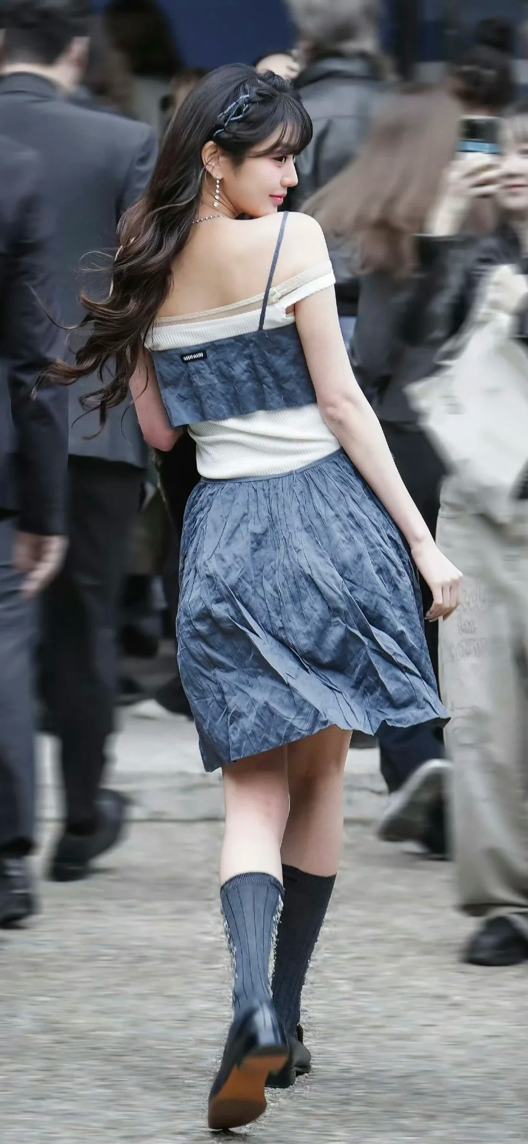 chiếm spotlight nhờ thiết kế đầm ren ôm sát, tôn vóc dáng quyến rũ. Điểm nhấn trong tạo hình của nàng IT Girl nằm ở công thức phối giày mũi nhọn cùng tất xám cao cổ "đặc sản" của nhà mốt Miu Miu.