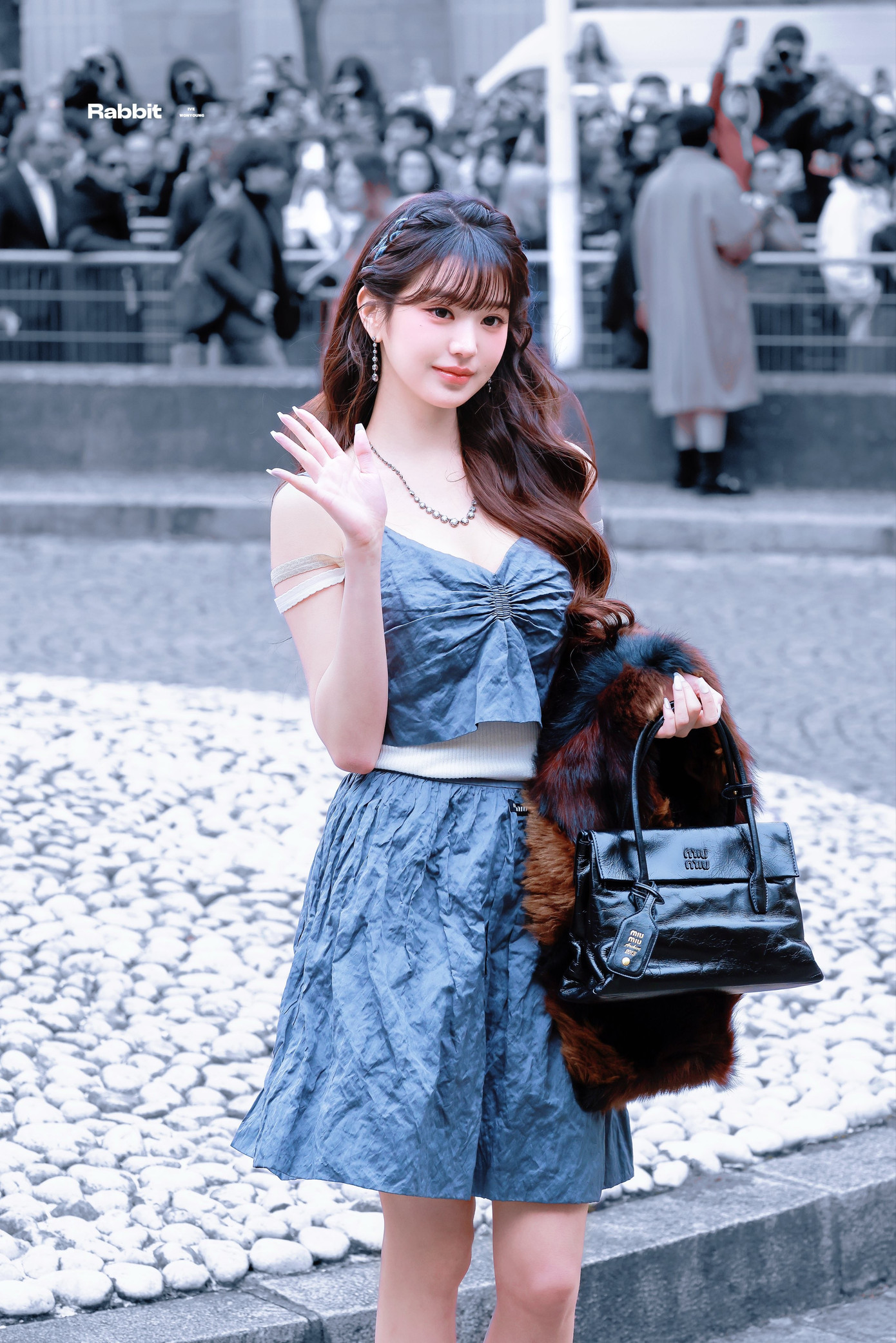 Trong thiết kế áo khoác lông phối giày Mary Jane cùng tất đùi, Ella MEOVV toát ra khí chất tiểu thư sang trọng. Kiểu trang điểm nhấn vào đôi mắt mèo sắc sảo cùng mái tóc tẩy uốn xoăn sóng cổ điển khiến nữ idol Gen Z càng thêm kiêu kỳ, thu hút mọi ánh nhìn.