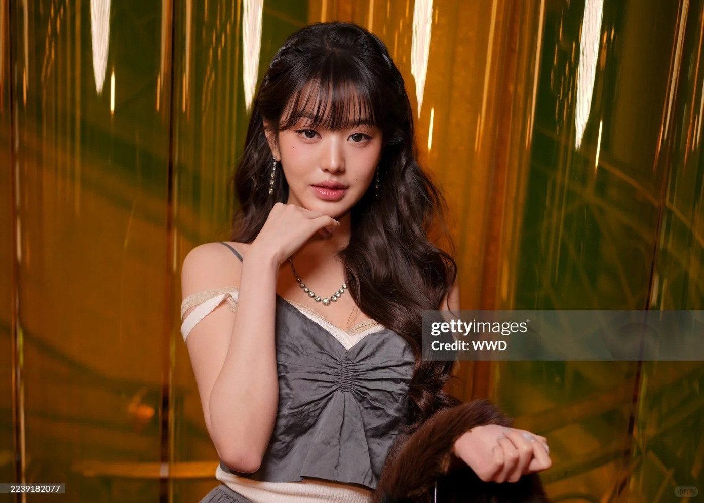 Jang Won Young đến với lần thứ 6, tiếp tục được ưu ái mặc thiết kế chưa được "trình làng" của thương hiệu. IT Girl xứ Hàn diện bộ đồ xám, chất liệu vải nhăn lạ mắt cùng áo len mỏng trễ vai bên trong.
