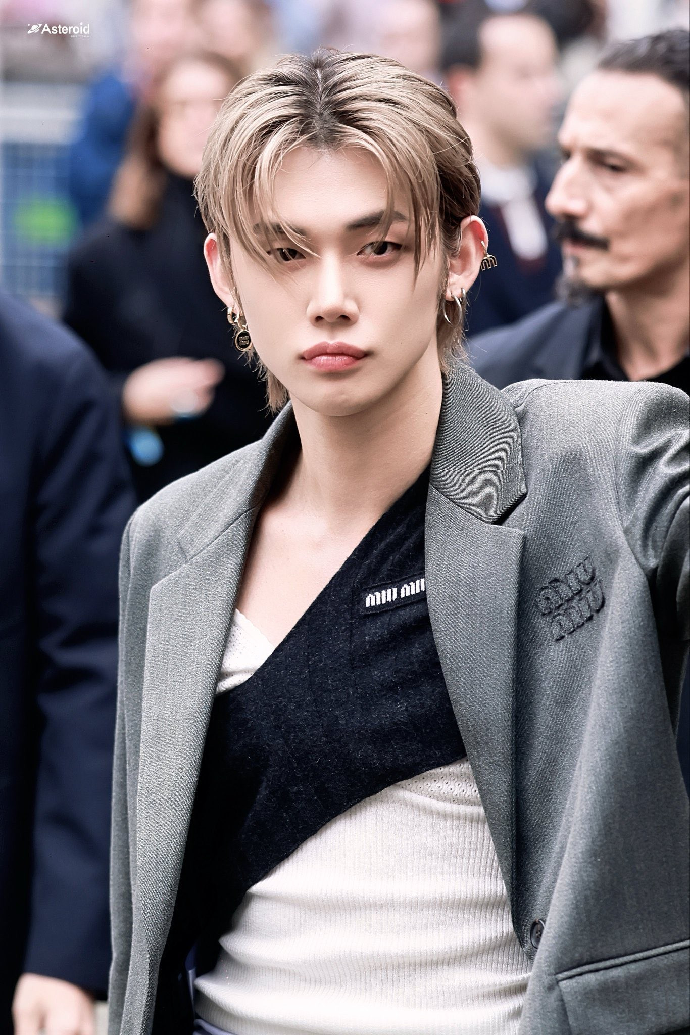 Cái tên gây bất ngờ tại sự kiện là Yeonjun . Mỹ nam xuất hiện trong bộ âu phục xám dáng rộng. Thay vì mặc sơ mi và cà vạt quen thuộc, nam idol phá cách với áo hai dây cách điệu cùng lớp vải đen quấn chéo tạo hiệu ứng thị giác lạ mắt.