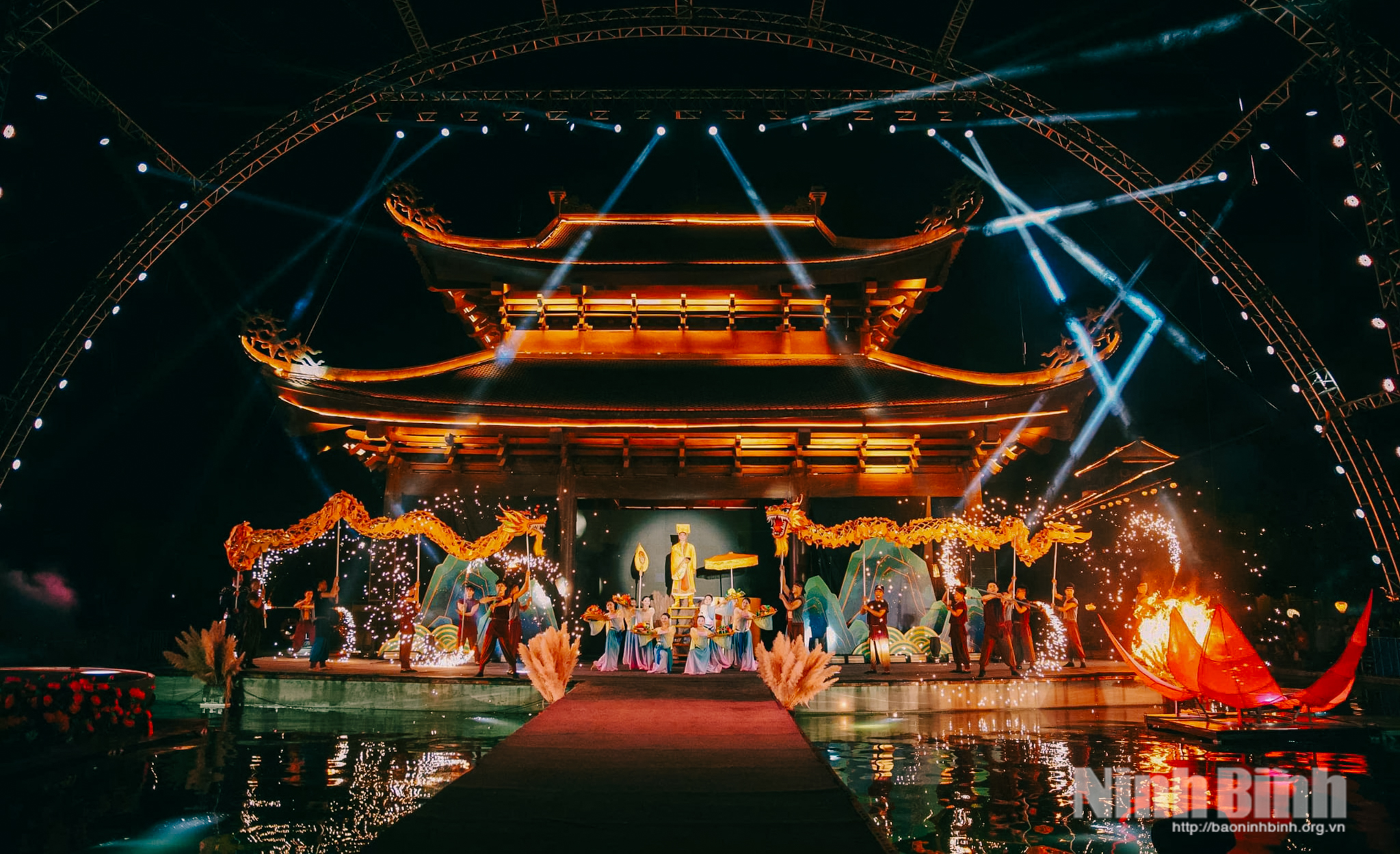Không gian sân khấu thực cảnh tại Phố cổ Hoa Lư được dàn dựng công phu và đầy tính nghệ thuật.