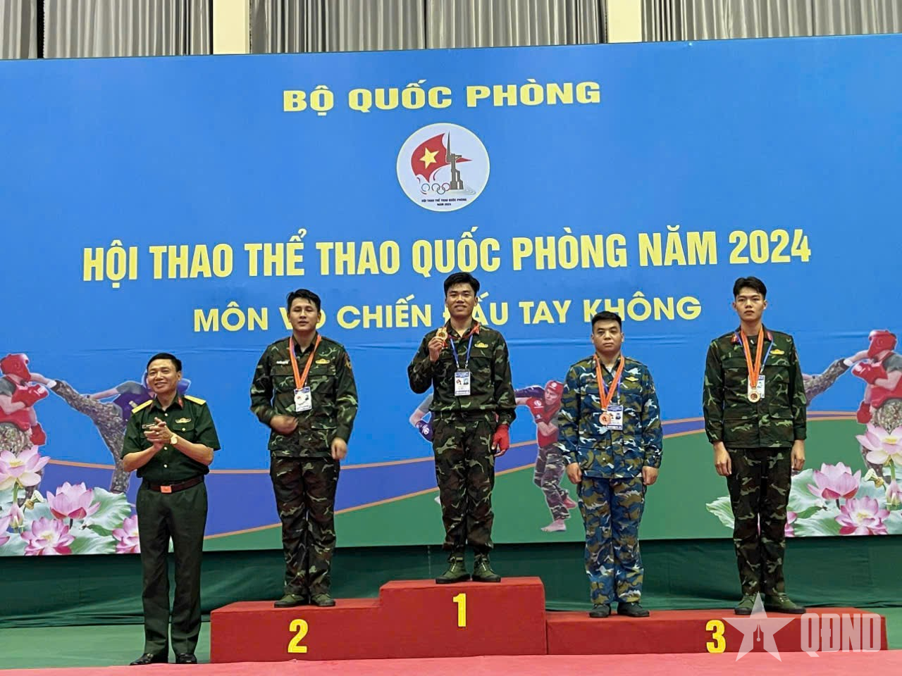 Thượng úy Phan Văn Vinh trên bục nhận huy chương vàng tại Hội thao thể thao quốc phòng năm 2024. Ảnh do nhân vật cung cấp