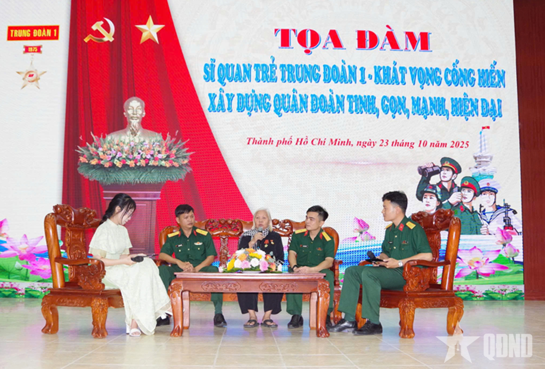 Tại buổi tọa đàm, cô Lê Thị Sương, nguyên cán bộ du kích TP Hồ Chí Minh, xúc động kể lại những năm tháng chiến đấu gian khổ, nhắn nhủ thế hệ trẻ: “Người chiến sĩ không chỉ biết chiến đấu mà còn phải sống đẹp, sống có trách nhiệm, để màu xanh áo chiến sĩ mãi mãi sáng giữa đời”. Đại diện hậu phương sĩ quan trẻ, cô giáo Đỗ Thị Bích Trâm, vợ của Trung úy Huỳnh Minh Phát, Trung đội trưởng ở Đại đội 7, Tiểu đoàn 2, Trung đoàn 1 chia sẻ: “Gia đình luôn là hậu phương vững chắc, tiếp thêm niềm tin để các anh yên tâm công tác, giữ trọn lời thề với Tổ quốc”.