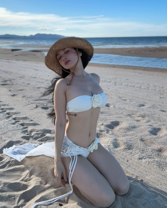 Nhìn chung, gu thời trang đi biển của Sĩ Thanh khá táo bạo với các thiết kế cut-out, halter neck hay bandeau top, giúp tôn dáng hiệu quả bằng cách nhấn vào phần eo và vai, tạo cảm giác thon gọn hơn. Những bộ đồ này phù hợp cho bãi biển riêng tư hoặc resort, nơi không khí thoải mái hơn, nhưng có thể gây tranh cãi ở không gian công cộng tại Việt Nam - nơi văn hóa vẫn nghiêng về sự kín đáo. Ảnh: FBNV