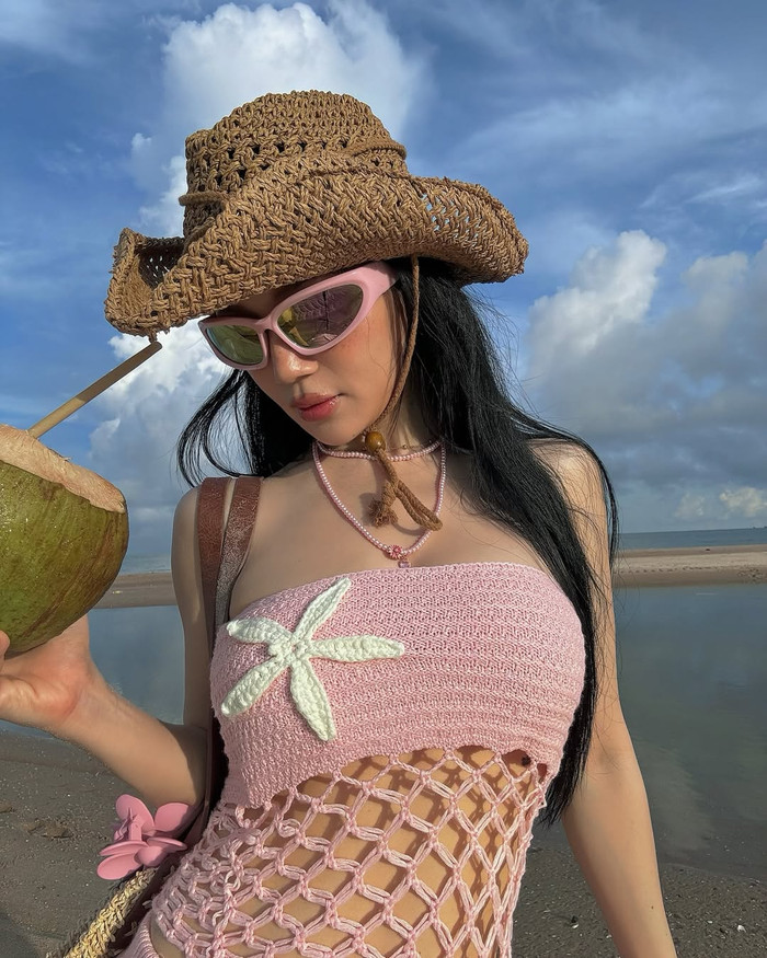Sĩ Thanh thường chọn những bộ trang phục đi biển từ các thương hiệu quen thuộc, nơi cô kết hợp giữa bikini, đầm maxi hở lưng và các set crop top với skirt ngắn. Trong các bức ảnh, Sĩ Thanh sử dụng đồ hiệu như kính râm, mũ rơm crochet hay thắt lưng da, tạo điểm nhấn sang trọng giữa bối cảnh thiên nhiên. Những món phụ kiện này không chỉ bảo vệ da khỏi nắng mà còn nâng tầm tổng thể, khiến outfit trở nên hài hòa hơn so với vẻ ngoài đơn thuần là đồ bơi. Ảnh: FBNV