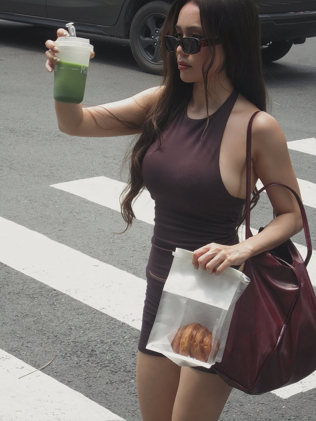 Sĩ Thanh xuất hiện với mái tóc dài bồng bềnh, gương mặt trang điểm sắc sảo, tự tin cầm trên tay ly nước và một chiếc bánh croissant, tạo nên những khoảnh khắc đời thường nhưng vô cùng thu hút. (Ảnh: IGNV)