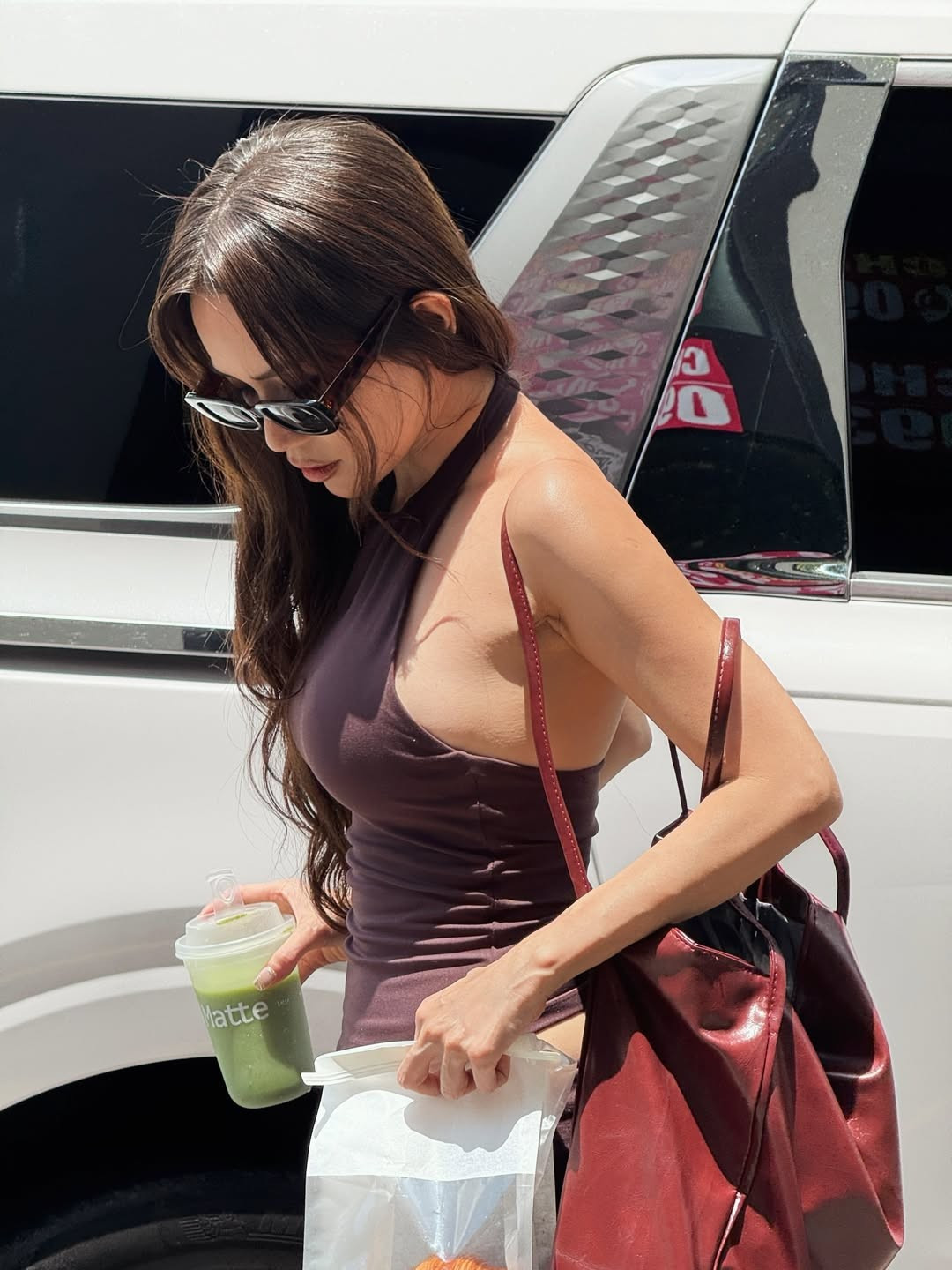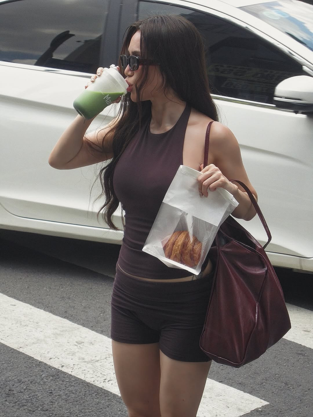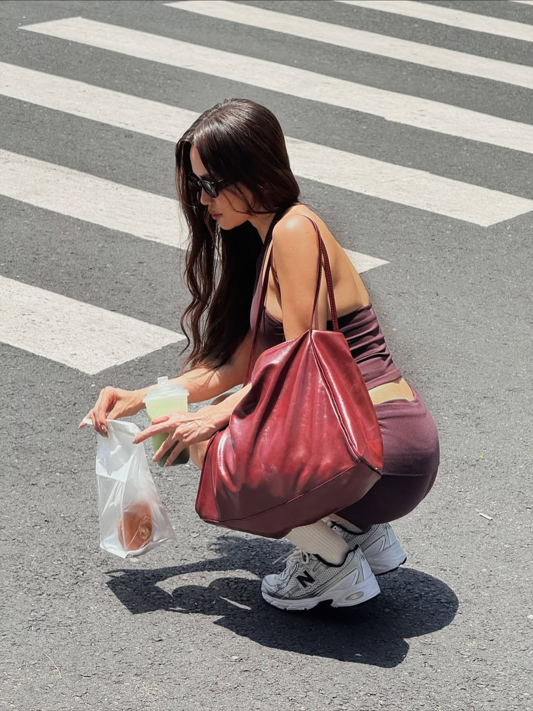 Sĩ Thanh lựa chọn chiếc túi da lớn màu đỏ mận là điểm nhấn màu sắc nổi bật và tạo sự cân bằng giữa nét khỏe khoắn của đồ tập và sự thanh lịch của thời trang dạo phố. (Ảnh: IGNV)