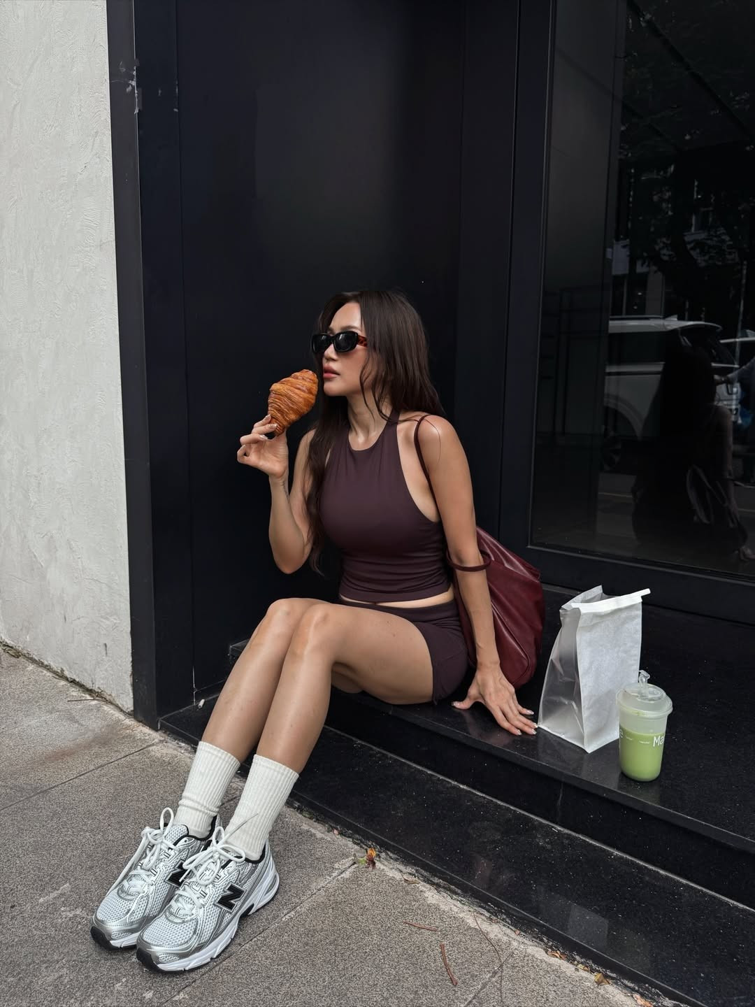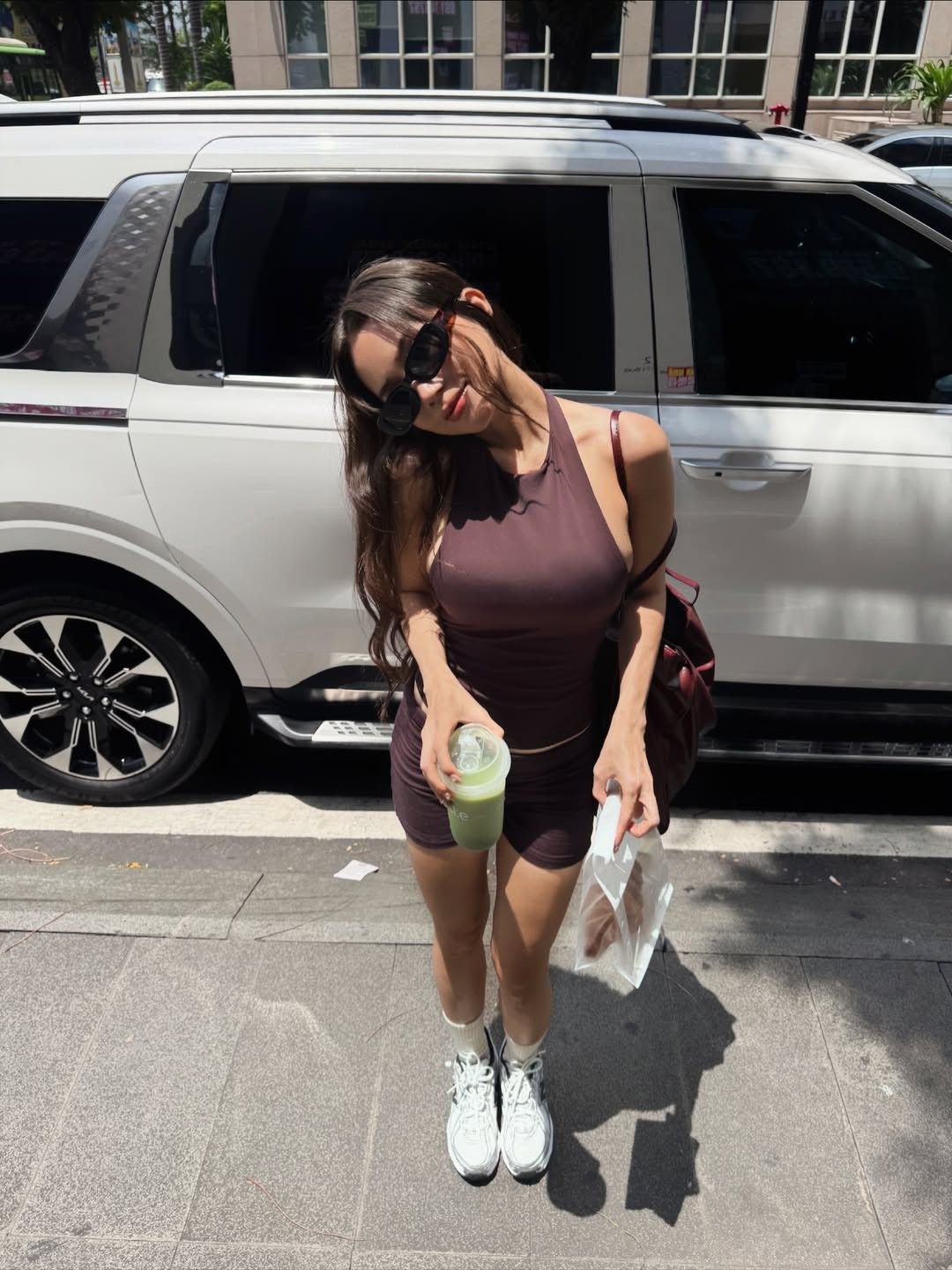 Trong loạt ảnh, Sĩ Thanh chọn một set đồ tập với bra top và quần short bó chẽn tông màu nâu trầm cực kỳ tôn da và tôn dáng. (Ảnh: IGNV)