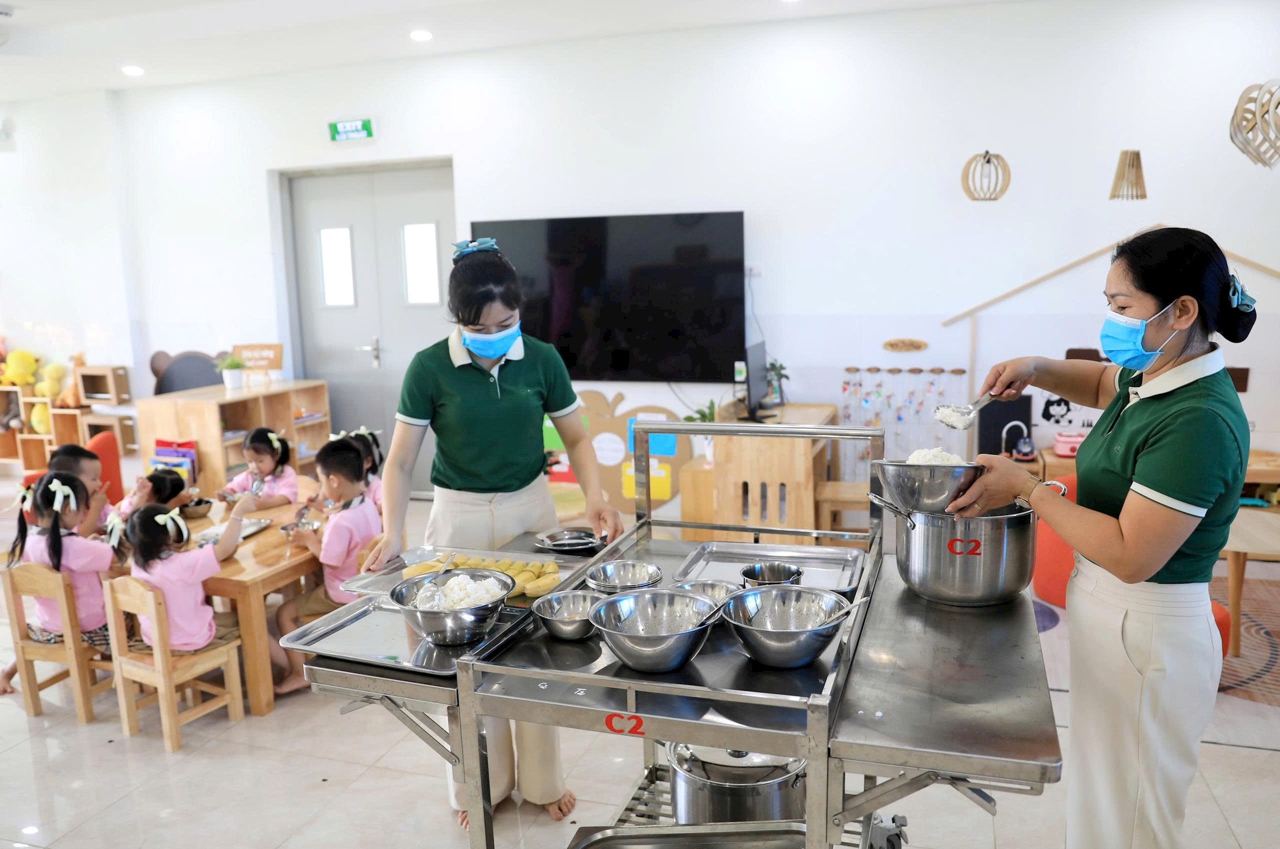 Chuẩn bị suất ăn cho học sinh tại một bếp ăn trường học. Ảnh minh họa