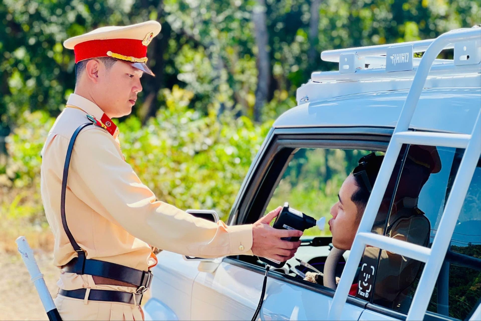 Cán bộ chiến sĩ Trạm CSGT Hàm Tân đo nồng độ cồn vào sáng Mùng 1 Tết, Bính Ngọ