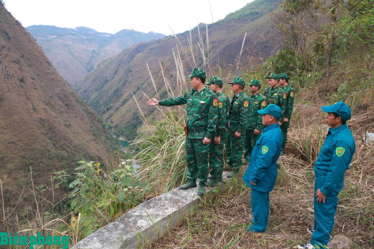 Cán bộ, chiến sĩ Đồn Biên phòng Lũng Cú, Bộ đội Biên phòng tỉnh Tuyên Quang phối hợp với lực lượng dân quân xã Lũng Cú tuần tra bảo vệ biên giới. Ảnh: Đơn vị cung cấp