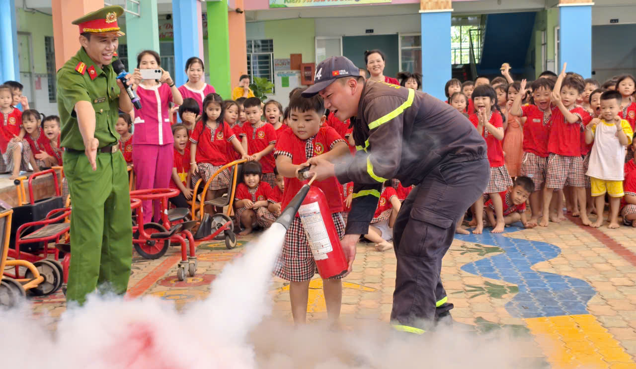 Học sinh mầm non hào hứng vì lần đầu tiên sử dụng bình chữa cháy xách tay